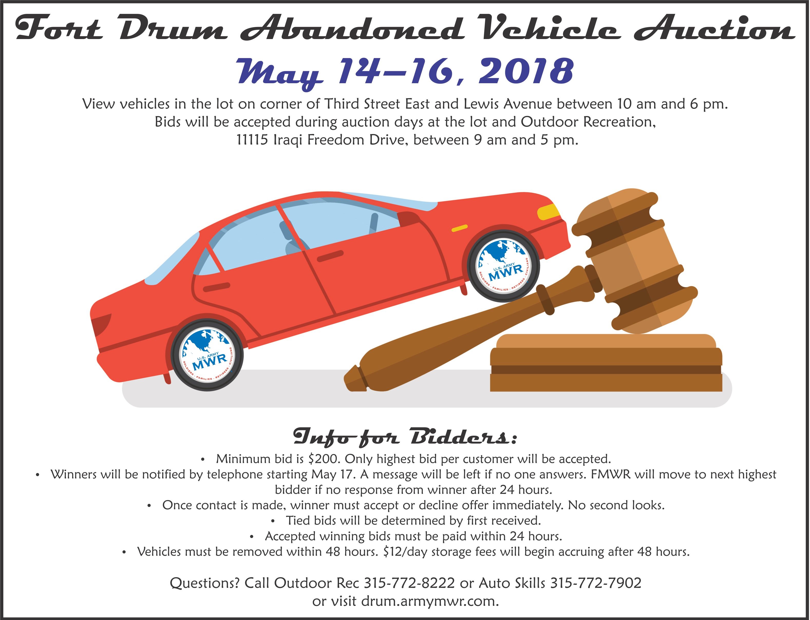 Fort Drum Outdoor Recreation and Auto Skills Center present a Silent Auction of Abandoned Privately-Owned Vehicles May 14–16.
