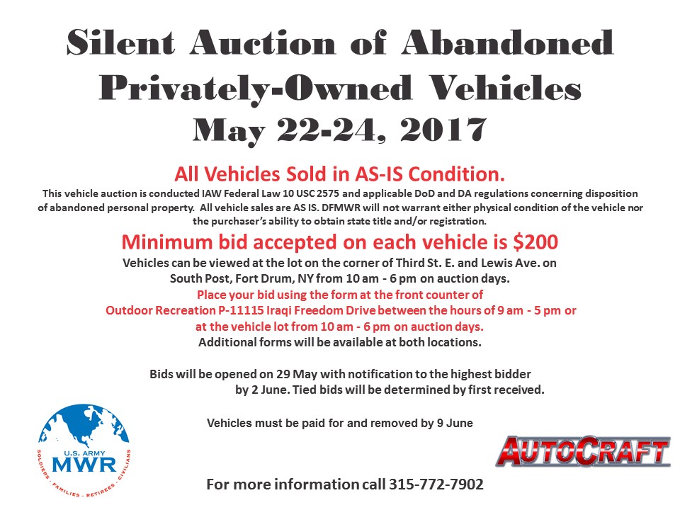 Fort Drum Outdoor Recreation and Auto Skills Center present a Silent Auction of Abandoned Privately-Owned Vehicles May 22–24. This vehicle auction is conducted IAW Federal Law 10 USC 2575 and applicable DoD and DA regulations concerning disposition of abandoned personal property. All vehicle sales are AS IS. DFMWR will not warrant either physical condition of the vehicle nor the purchaser’s ability to obtain state title and/or registration. Minimum bid on any vehicle is $200.