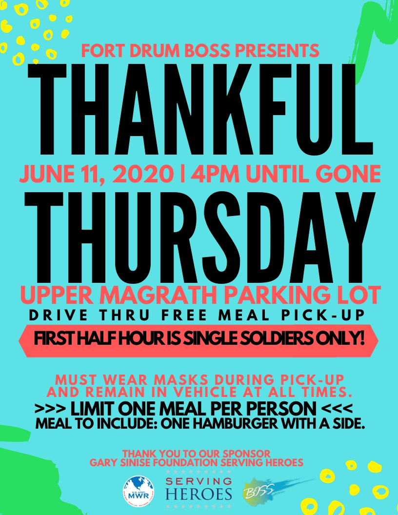 We have a great Thankful Thursday planned for you! Fort Drum BOSS will be handing out FREE indiviual dinner meals. Meet us at the upper parking lot of Magrath Sports Complex.