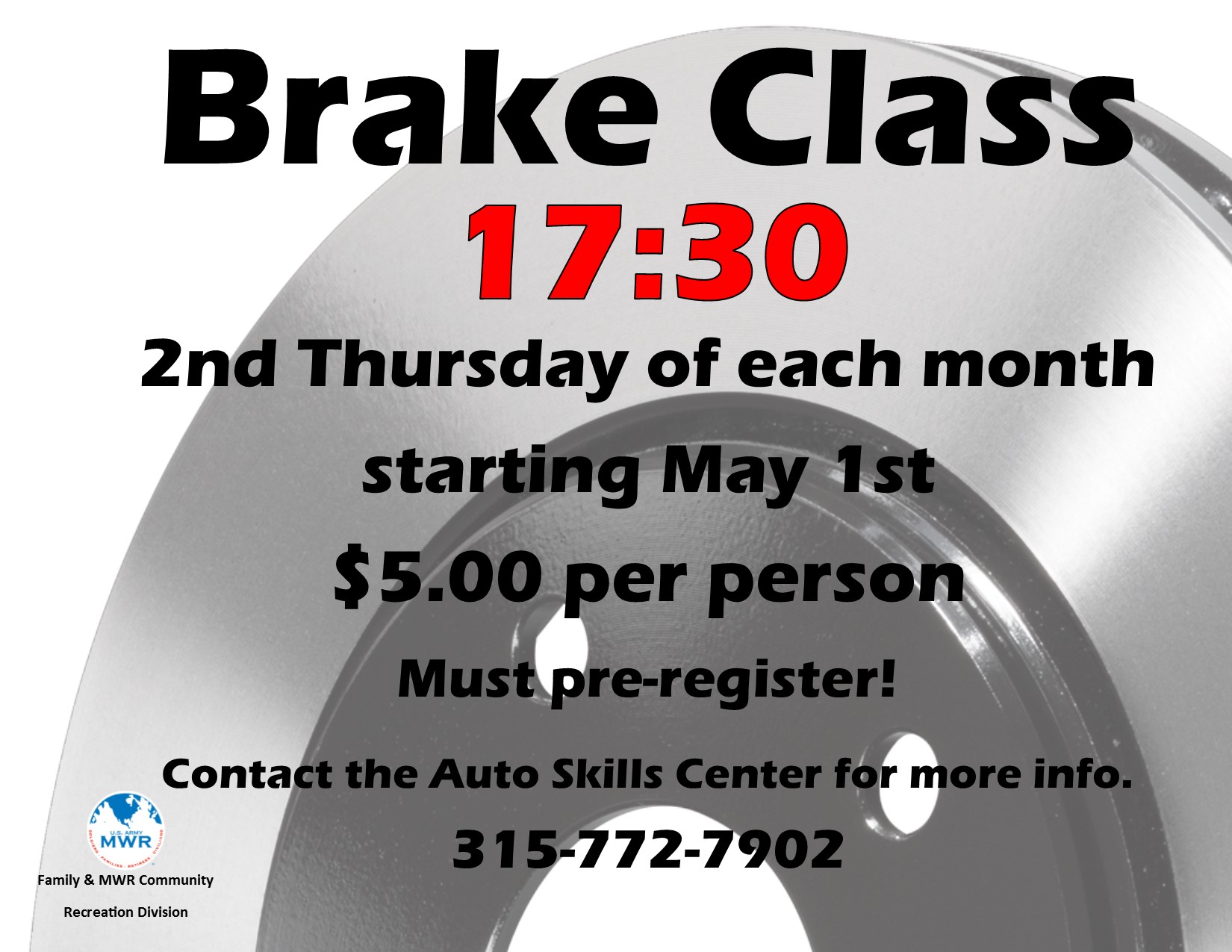 Date Time Tuesday 12 PM Wednesday 12 PM Thursday 12 PM Friday 12 PM Please call 315-772-7902 to sign up. This orientation class is open to ID card holders only and is required for ages 14 and up, even for those wishing to assist with a parent or guardian. The class will introduce you to Auto Skills and how it operates, as well as required safety rules.