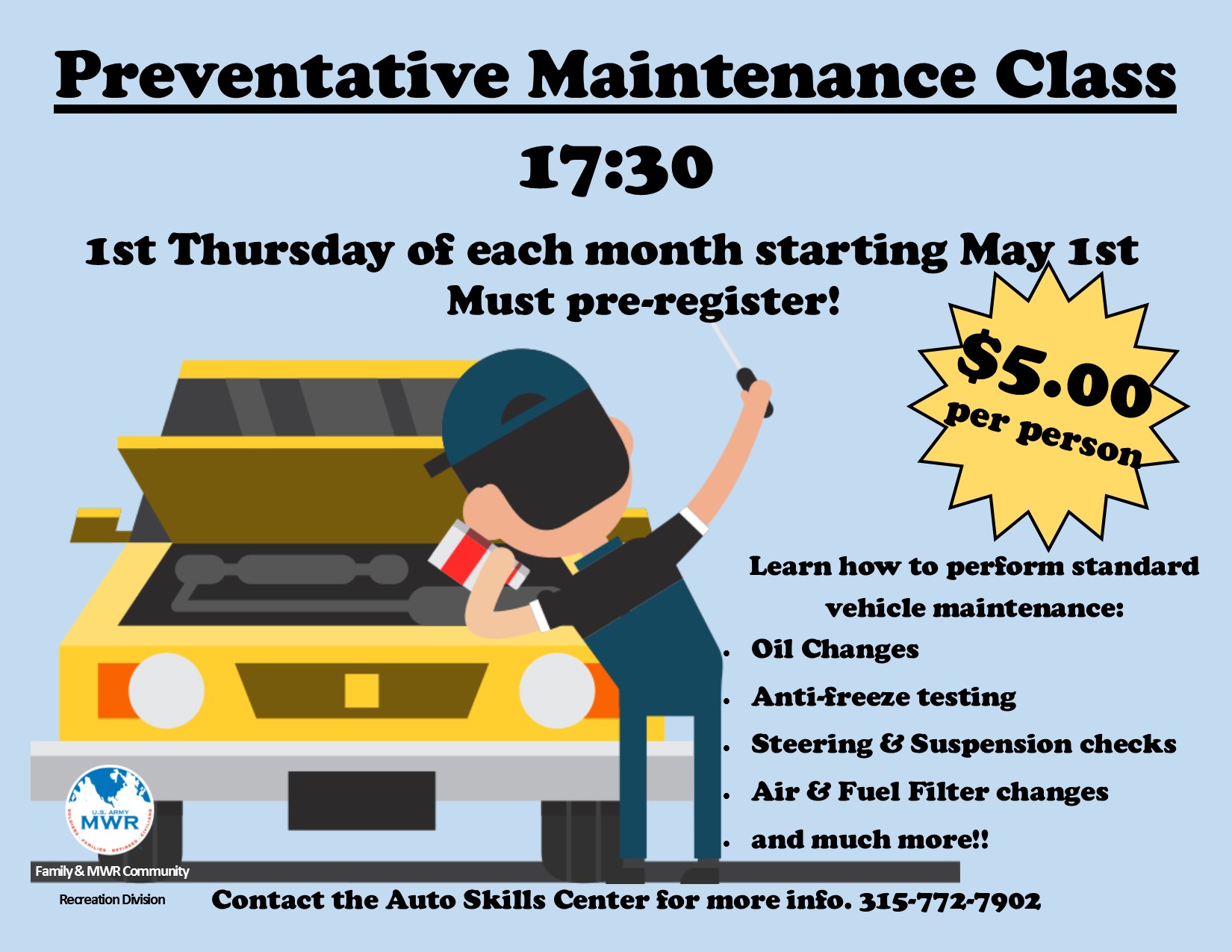 The Automotive Skills Center provides Soldiers, Family members, and DoD civilians with instruction, tools, and the space needed to perform regular maintenance on your vehicles, all at a low cost. Download our current pricing list for more details.