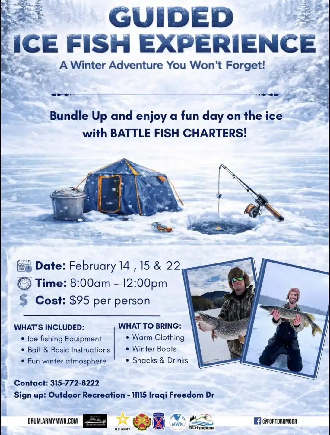 Bundle up and enjoy a fun day on the ice with ODR! $95 per person (18+). Includes transportation, fishing equipment, bait and a fun winter atmosphere! Visit Outdoor Recreation or call 315-772-8222 to register by February 11.
