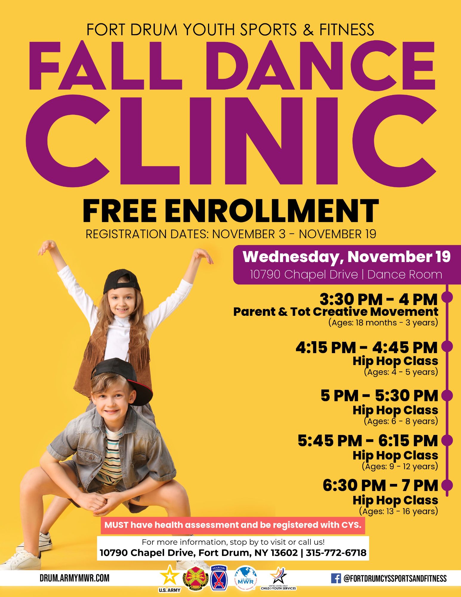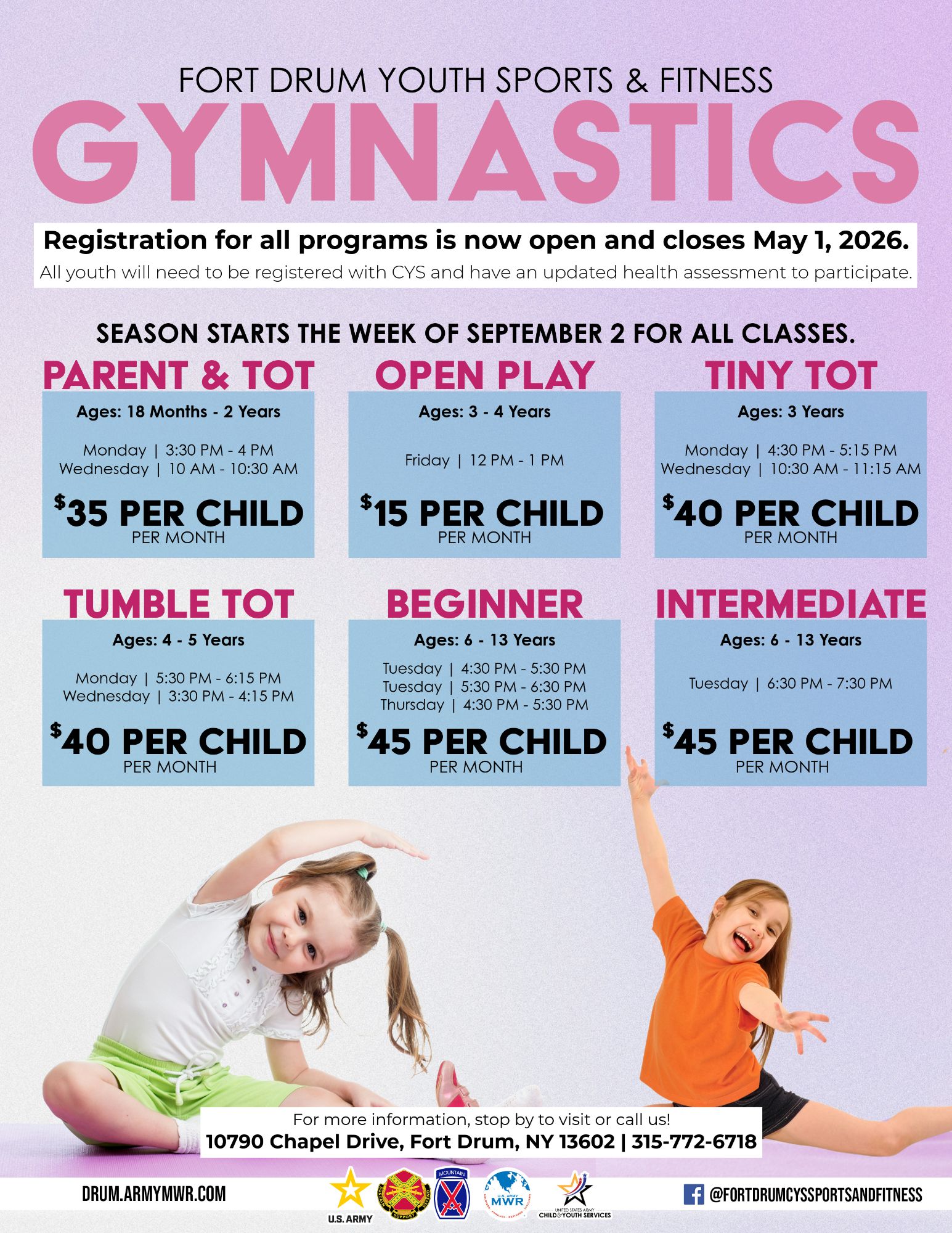 Locations: Child Development Centers, School Age Center, Middle School & Teen Center, Youth Sports and Fitness